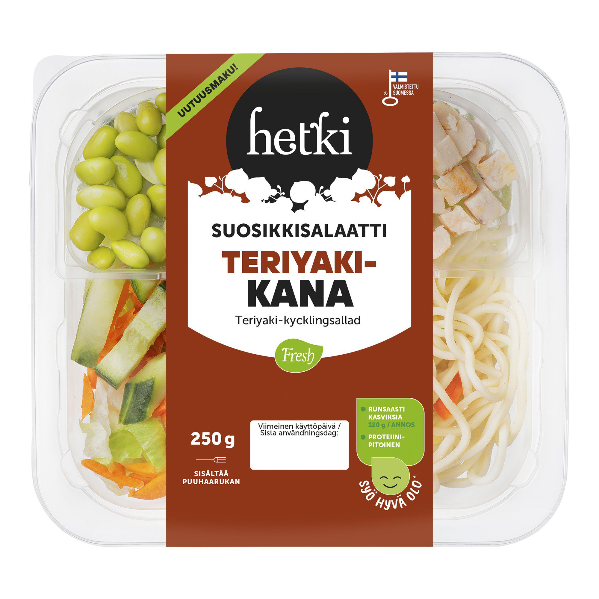 Uutuussalaatti Teriyaki-kana tuo Aasialaisen makumaailman myös Suosikki-salaattiaterioihin. Salaattipohjassa on jäävuori- ja romasalaattia, porkkanaa ja kurkkua. Aasialaista twistiä tuo kevyesti pikkelöity