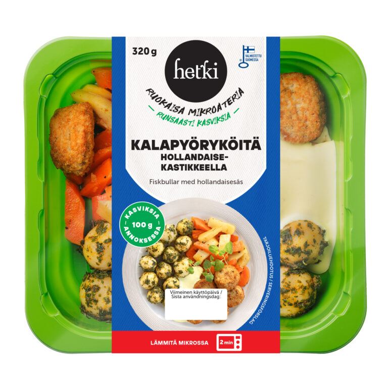 Juuressekoitus 32 % (porkkana, palsternakka, rypsiöljy, hunaja, jodioitu suola, mustapippuri), maustettu peruna (peruna, rapsiöljy, mausteseos (suola, mausteet (persilja, valkosipuli, paprika), dekstroosi (maissi), sitruunajauhe, aromit (hiivauute, valkosipuli, sipuli, tomaatti, sitruuna)), pinaatti), SEITIpyörykkä 25 % (SEITI (Pollachius virens) 16 %, rypsi- ja rapsiöljy, korppujauho (VEHNÄJAUHO, suola), vesi, sipuli, perunahiutale, perunajauho, aromit (KALA- ja umamiaromi, mustapippuri), tilli, dekstroosi, suola, maltodekstriini), hollandaisekastike 12 % (vesi, rapsiöljy, sitruunapyree, KANANMUNA, valkoviinietikka, sokeri, suola, muunnettu maissitärkkelys, sitruskuitu, maissitärkkelys, sakeuttamisaineet (E415, E412), happamuudensäätöaineet (E330, E500), voiaromi, kurkuma, valkopippuri, säilöntäaineet (E202, E211), väri (E160a))