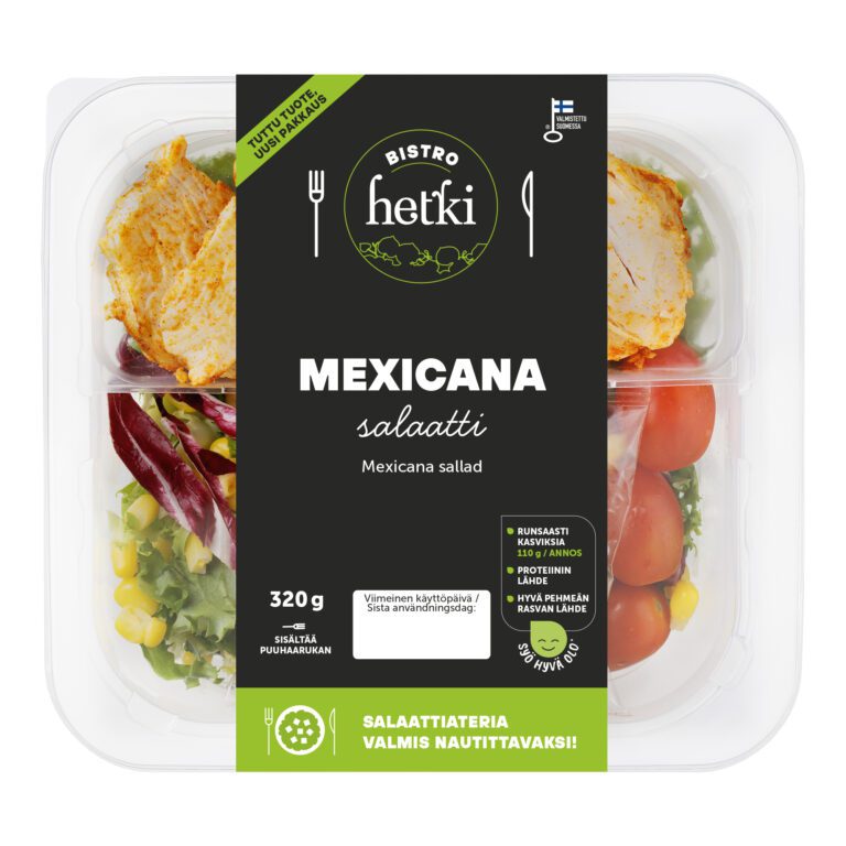 Maustettu riisi 25 % (keitetty riisi (vesi, riisi, suola, kurkuma), sitrusvinegretti (rapsiöljy, valkoviinietikka, vesi, sokeri, hunaja, extra-neitsytoliiviöljy, sitruunatäysmehutiiviste, mandariinimehutiiviste, sitruunankuori, sakeuttamisaineet (E407, E415), aromit, jalapeno), korianteritahna (korianteri, vesi, auringonkukkaöljy, suola, sokeri, happamuudensäätöaineet (E260, E330)), suola), broileri 20 % (broilerin rintafilee (EU), dekstroosi, suola, perunatärkkelys, sokeri, auringonkukkaöljy, stabilointiaine (E451), mausteet (chili, juustokumina, valkosipuli, sipuli, oregano), hiivauute, perunakuitu, jauhonparanne (E551), mausteuute (paprika)), tomaatti, friseesalaatti, maissi, punasalaatti