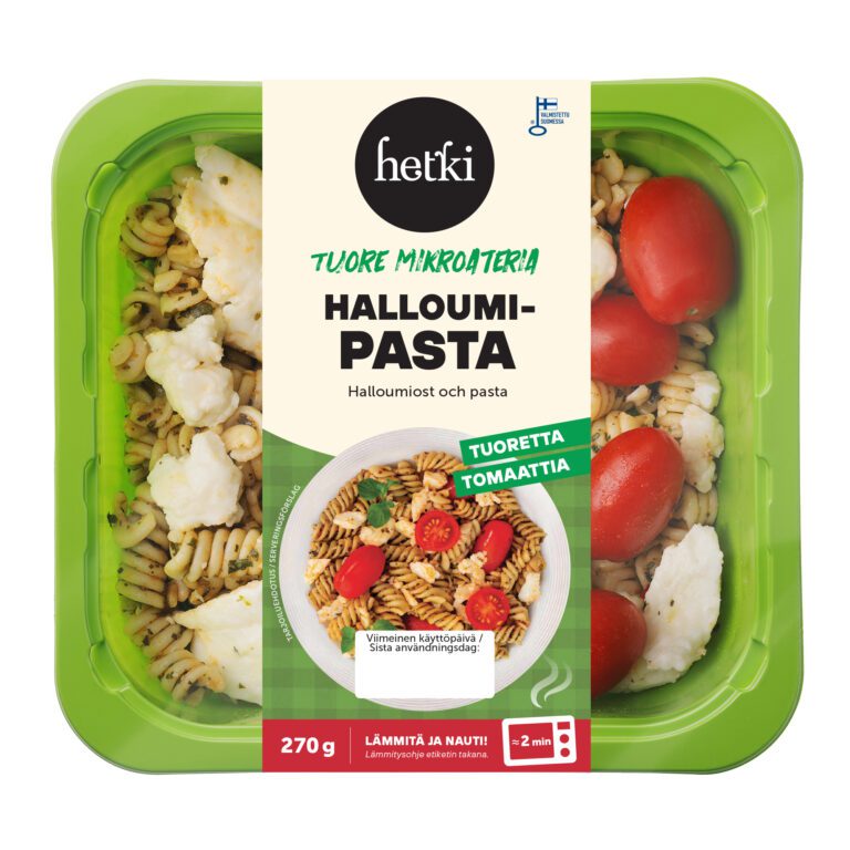 Välimeren tuoksut tuulahtavat mikrosta, kun lämmität Halloumi-pasta mikroaterian. Pestolla ja välimeren mausteöljyllä maustettu fusillipasta, halloumijuusto sekä tuore tomaatti muodostavat herkullisen makukokonaisuuden.