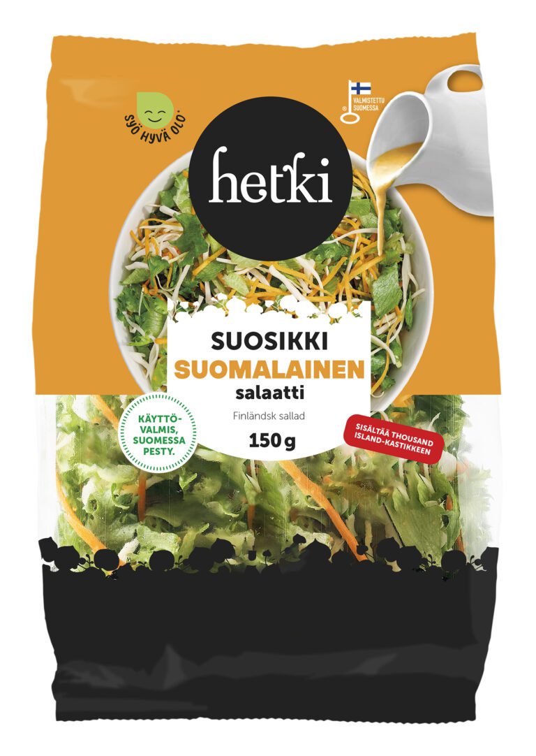 Raikas salaattisekoitus valmiiksi pestyistä kotimaisista raaka-aineista. Jääsalaatti-, valkokaali- ja porkkanasekoitus kruunataan maukkaalla Thousand Island-kastikkeella.